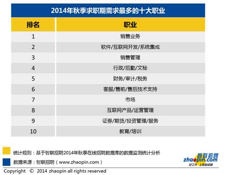 1、2014年秋季全國需求最旺盛的十個職業