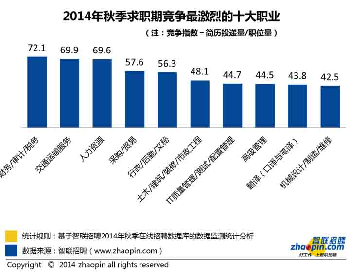 獵頭公司在線數據顯示,從2014年秋季各職業的競爭情況來看,競爭最為激烈的職業是財務/審計/稅務、交通運輸服務、人力資源,這三個職業的競爭指數分別為72.1,69.9,69.6。這三大職業在夏季求職期的競爭指數也最高。出現這一現象的原因在于:財務/審計/稅務崗位的人員需求量較小,同時人員流動性較小,造成職位數量有限;同時人才市場又供應了大量的相關專業人才,財務相關專業人才一般傾向于從事專業對口的崗位,從而導致財務/審計/稅務崗位的競爭十分激烈。