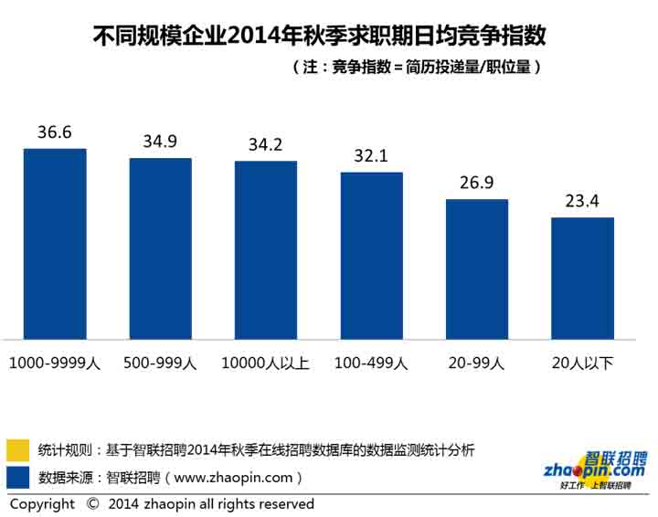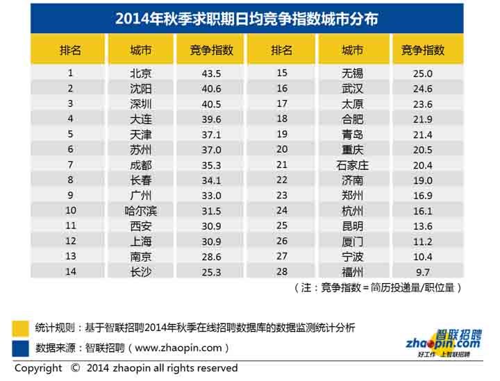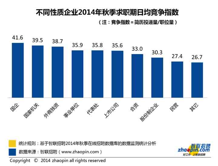 1、全國競爭指數:2014年秋季平均30.7人競爭一個崗位