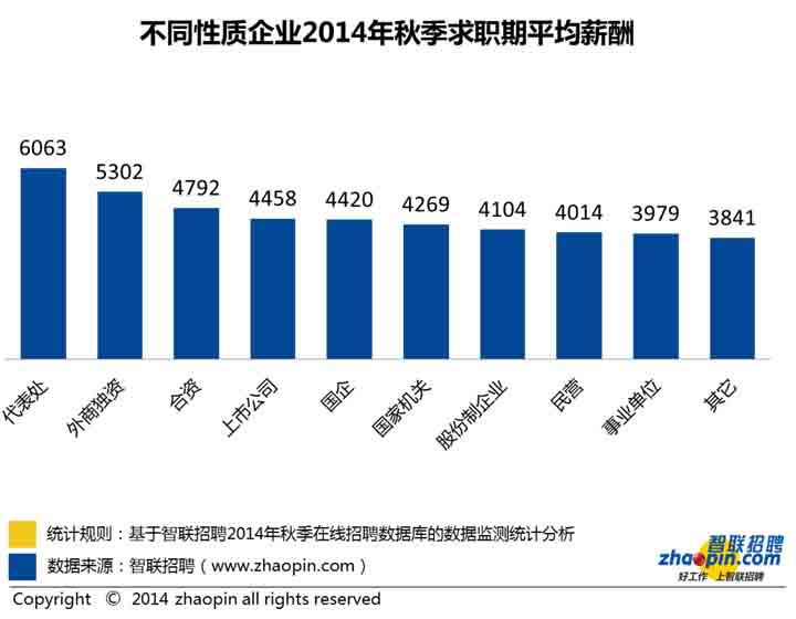 獵頭公司在線數據顯示,從2014年秋季不同性質企業的平均薪酬來看,代表處薪酬最高,達到6063元,其次是外商獨資,平均薪酬為5302元,再次是合資企業,平均薪酬為4792元。總體來看,外資企業薪酬最高,其次是國企,民營企業平均薪資低于外企和國企。獵頭公司專家指出,外企薪酬高的原因在于工作壓力較大,所有的工作回報均通過薪酬進行體現,因此薪酬水平較高。而工作的回報不光是薪酬,還有福利、工作與生活的平衡、身體健康等,因此需要綜合評估工作的投資回報是否合理。
