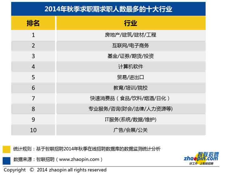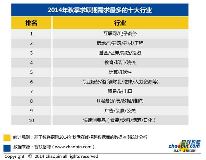 1、2014年秋季全國需求最旺盛的十個行業