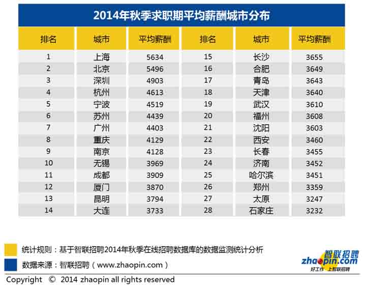 1、2014年各城市平均薪酬排行榜