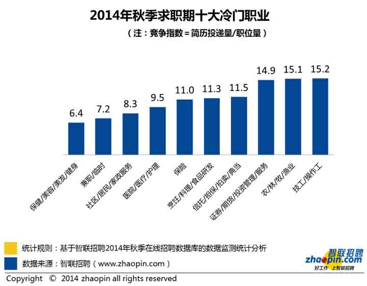 獵頭公司在線數據顯示,從2014年秋季全國情況來看,最冷門的三大職業依次為:保健/美容/美發/健身、兼職/臨時、社區/居民/家政服務,競爭指數分別為6.4,7.2,8.3。兼職/臨時工作受限于不穩定、收入低等因素較少受求職者青睞。保健/美容/美發/健身和社區/居民/家政服務類工作不但需要相關的專業技能,且勞動強度大,收入相對較低,相關福利保障缺乏,導致這些職業長期處于供小于求的狀態。