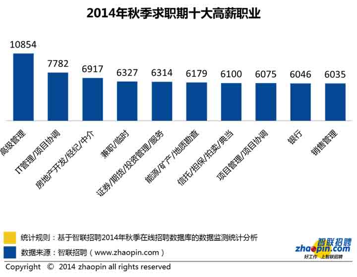 獵頭公司在線數據顯示,從2014年秋季各職業的薪酬來看,高級管理這一職業的薪酬位居榜首,高達10854元,其次是IT管理/項目協調,月薪為7782元,再次是房地產開發/經紀/中介,平均月薪為6917元。高級管理和IT管理/項目協調的共同特征在于對應聘者的專業技能要求非常高,因此相應地,職位的薪酬回報也處于高位。房地產開發/經紀/中介因行業特性,隨著近年來樓市的水漲船高,薪酬水平也較高。