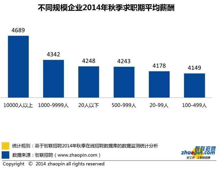 獵頭公司在線數據顯示,從2014年秋季不同規模企業的平均薪酬來看,10000人以上規模的超大型企業薪酬最高,達到4689元,其次是1000-9999人規模的企業,平均薪酬為4342元,再次是20人以下規模的小微企業,平均薪酬為4248元。總體來看,超大型規模企業和小微企業薪酬最高,大中型企業薪酬水平居中。獵頭公司專家指出,小微企業因企業知名度較低等原因限制未能得到求職者青睞,但小微企業的薪酬處于較高水平,且具有更好的發展機會和施展空間,對于亟待提高個人工作能力的求職者來說,不失為一個好的選擇。